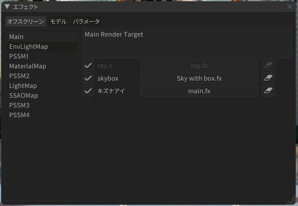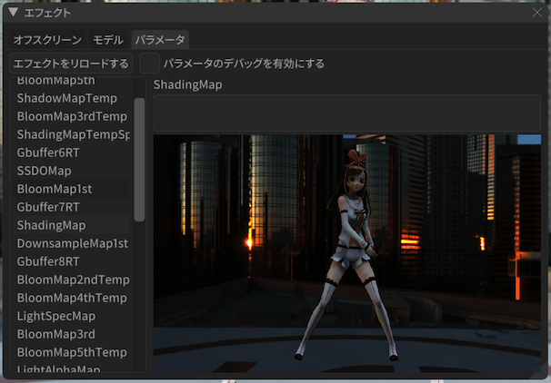 パス、レンダーターゲットの一覧を表示します。「エフェクトをリロードする」ボタンを押すと選択しているモデルまたはアクセサリのエフェクトをリロードすることができます。
