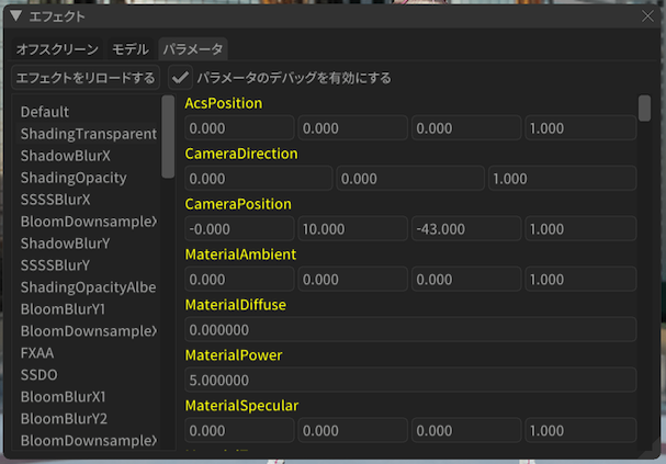 「パラメータのデバッグを有効にする」を有効にするとエフェクトに割り当てられるパラメータの中身を表示します。