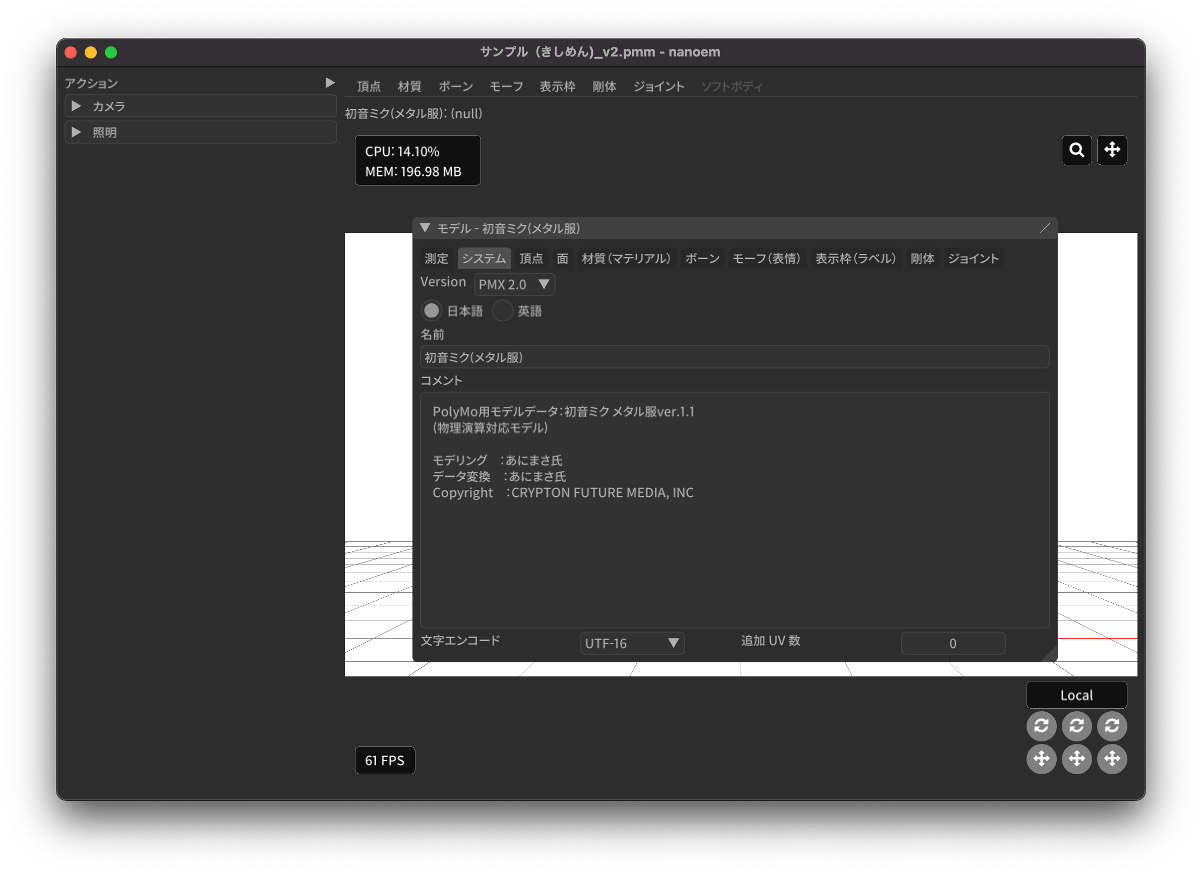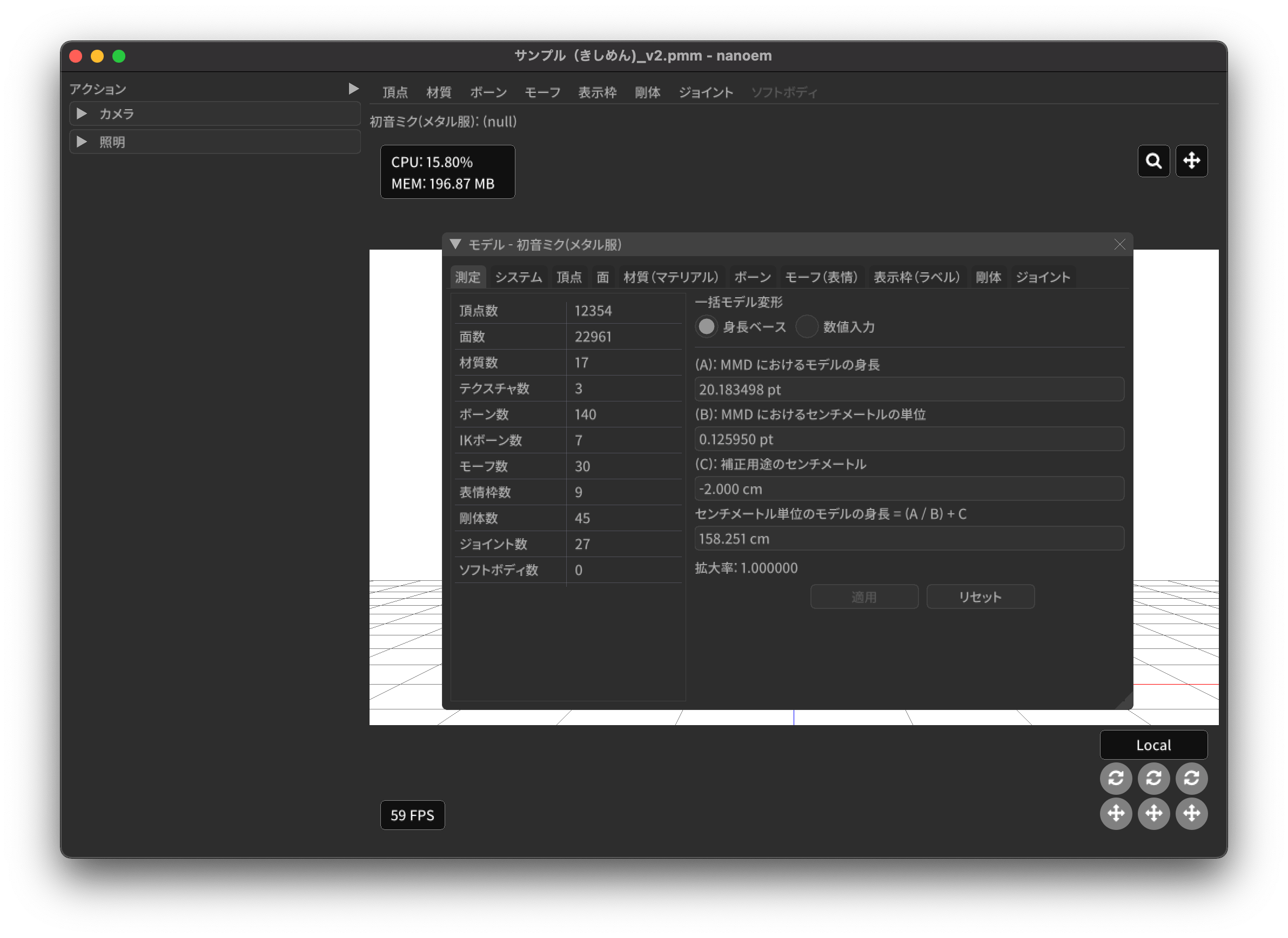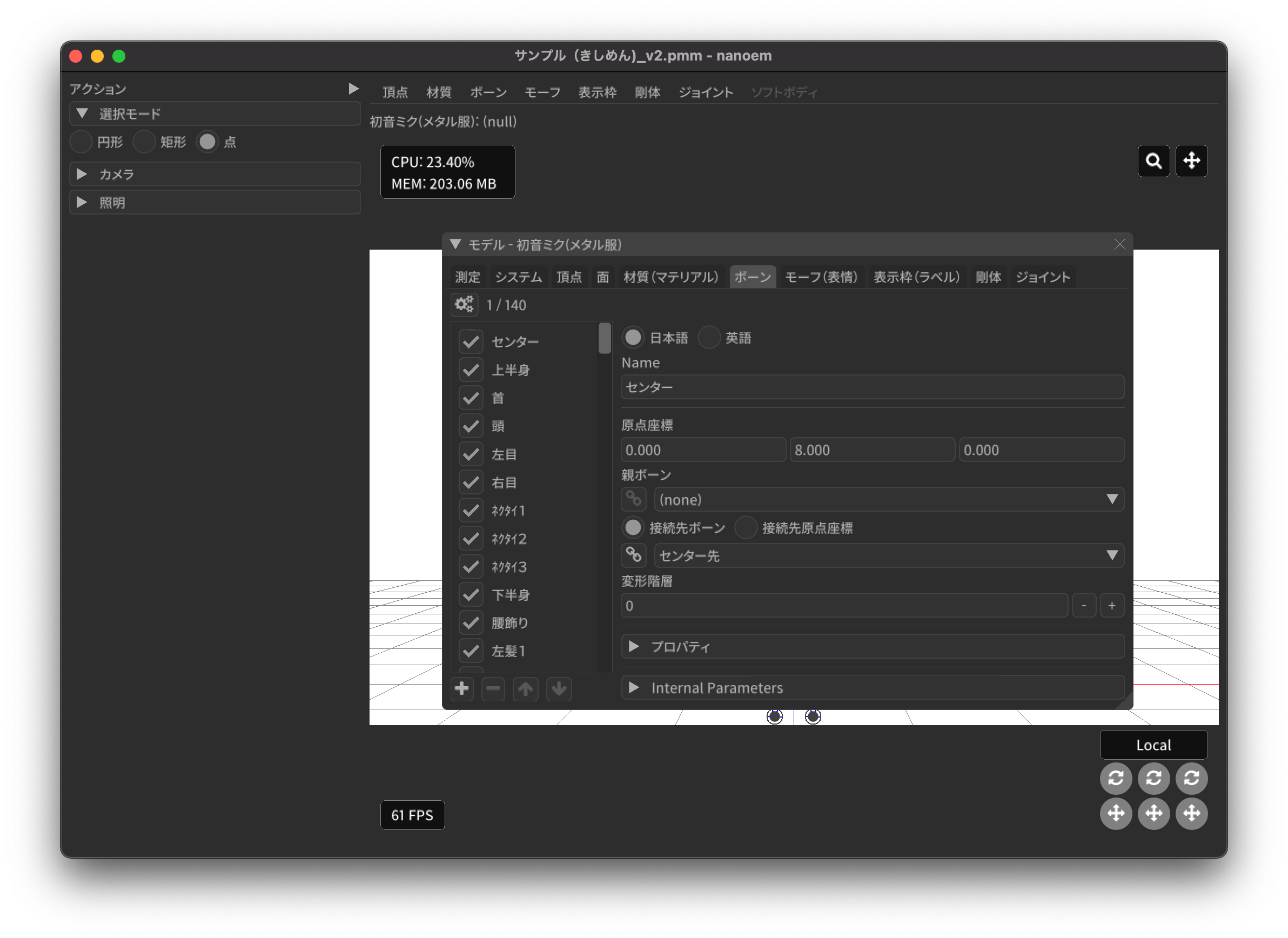 モデル編集ウィンドウを閉じると編集前の状態に戻ります。この時編集されたモデルが直接反映され、 モデル編集前のデータのコピーがモデル名にモデル編集モードに切り替えた日時を追加したファイル名で保存されます。 これは編集モード中からアプリケーション終了(ただしクラッシュによる強制終了は除く)する場合でも同様に行われます。