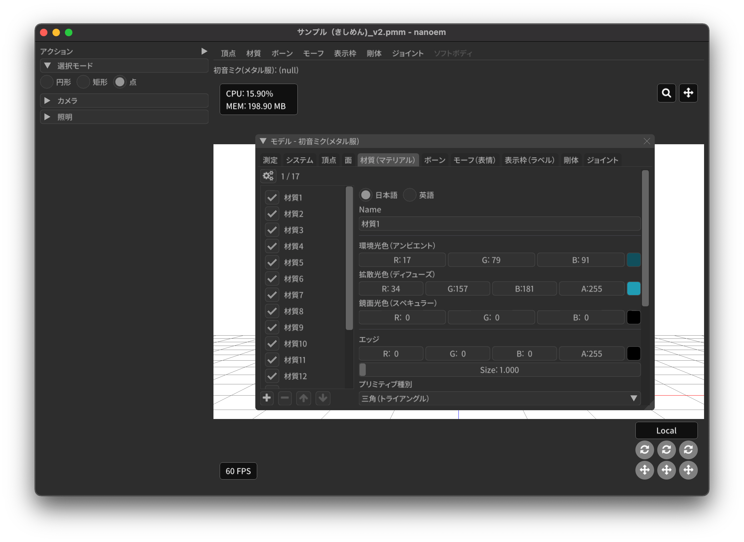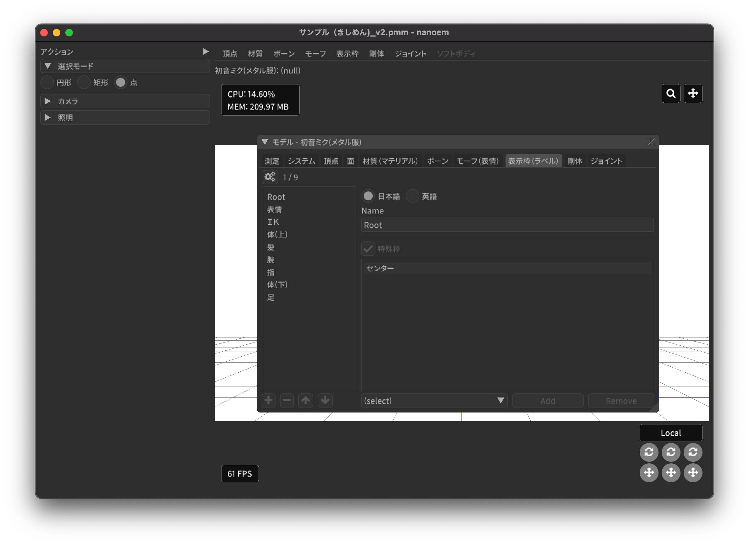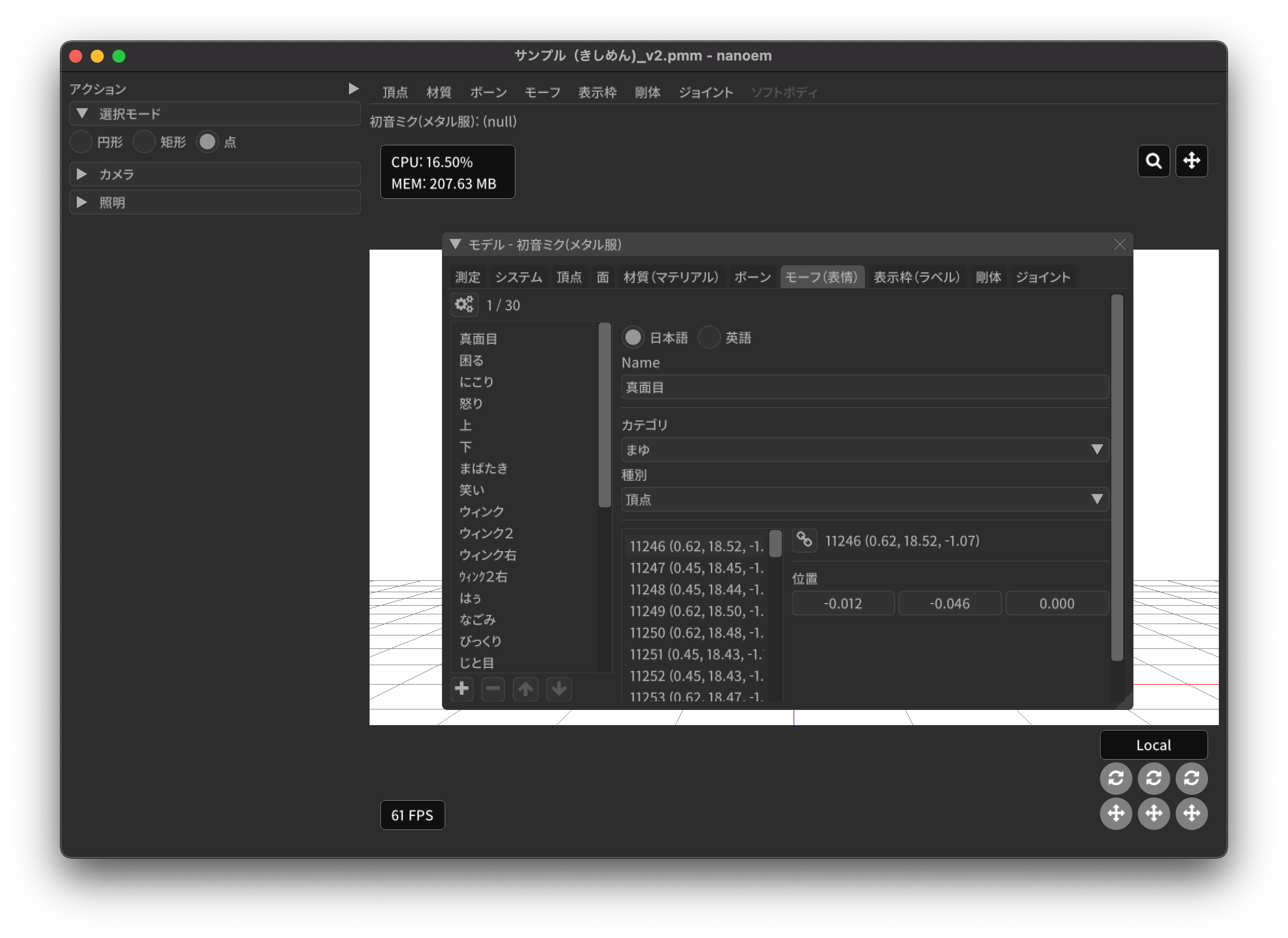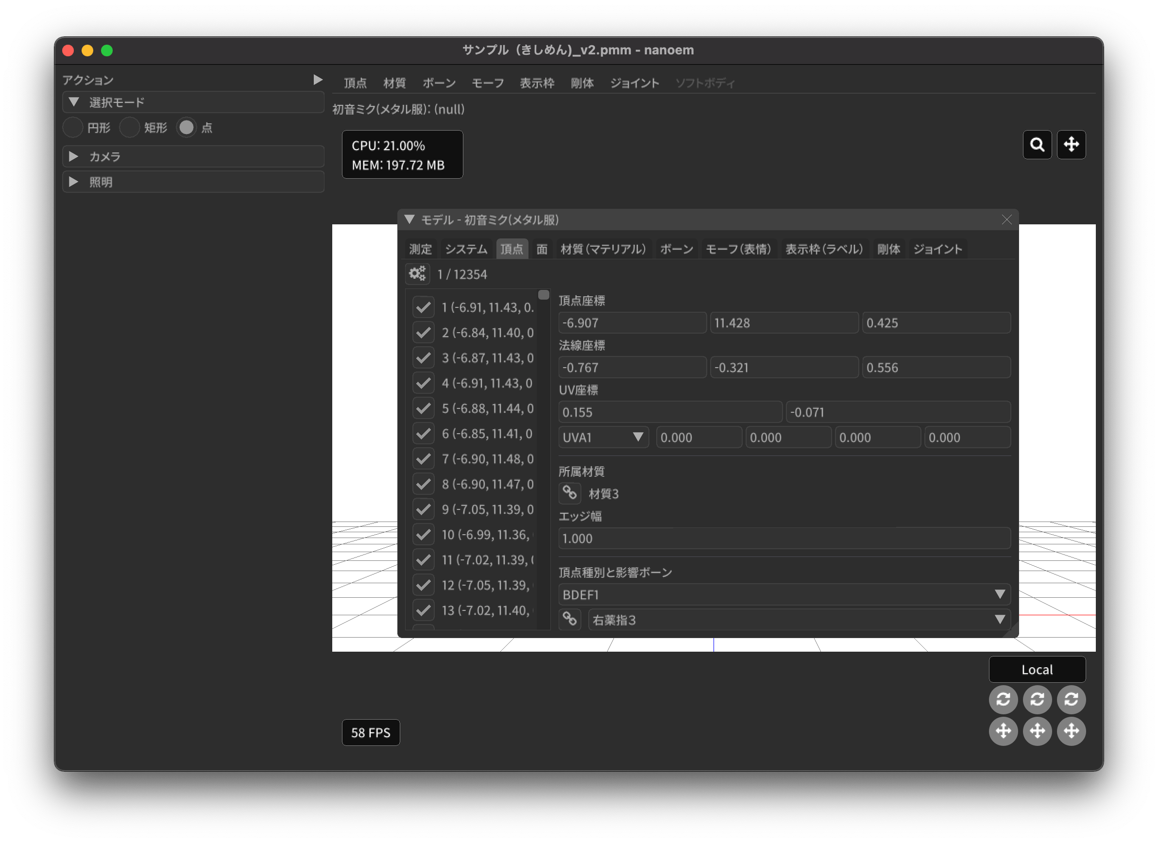 モデル編集ウィンドウを閉じると編集前の状態に戻ります。この時編集されたモデルが直接反映され、 モデル編集前のデータのコピーがモデル名にモデル編集モードに切り替えた日時を追加したファイル名で保存されます。 これは編集モード中からアプリケーション終了(ただしクラッシュによる強制終了は除く)する場合でも同様に行われます。
