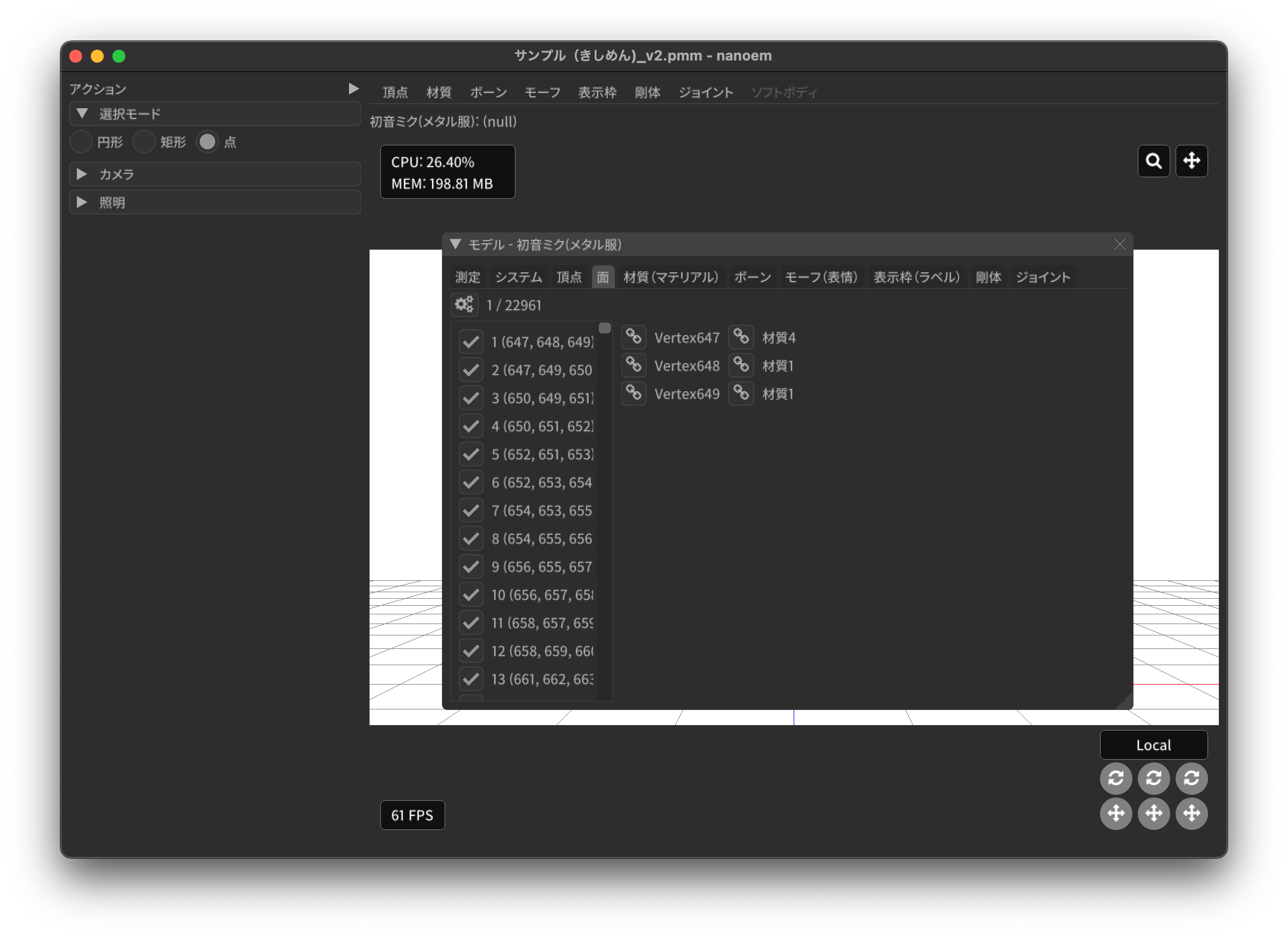 モデルオブジェクト一覧には名前の左側に表示マスキング用途のチェックボックスがあり、✅状態でモデル編集モードにおいて選択可能になります。 逆に外れている場合は選択できません。うまく利用することで特定のモデルオブジェクトだけ選択することが容易になります。