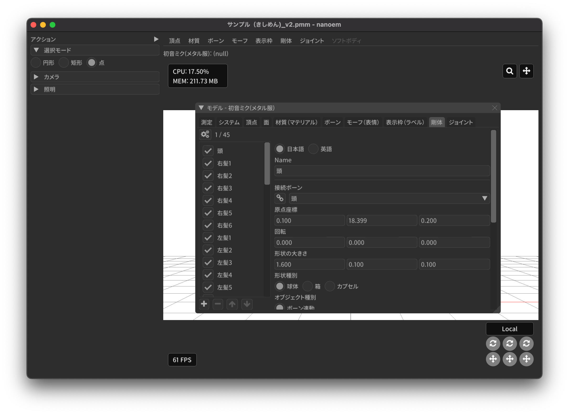 選択すると剛体の形状種別に応じて描画され、選択された剛体は赤く表示されます。 選択基準は剛体の原点座標が選択範囲に含まれるかどうかで判定されます。